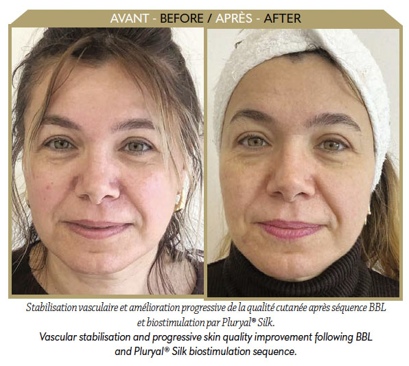 L’association n’est pas simplement additive : la stabilisation obtenue par la BBL est consolidée par l’action biostimulante de Pluryal® Silk, favorisant une amélioration durable de la qualité cutanée. Un entretien est ensuite proposé tous les quatre à six mois, principalement par Pluryal® Silk, avec BBL si nécessaire selon l’évolution clinique. Cette approche permet une diminution progressive de l’érythème, une meilleure homogénéité du teint et une réduction durable de la sensibilité cutanée. Il s’agit d’une véritable stratégie d’esthétique régénérative.
